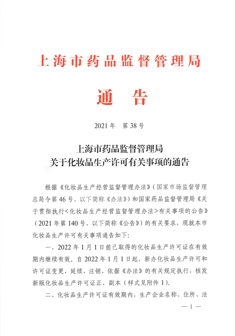 一、2022年1月1日前已取得的化妆品生产许可证在有效期内继续有效。自2022年1月1日起,新办化妆品生产许可和许可证变更、延续、注销,依据《办法》的有关规定执行,核发新版化妆品生产许可证正、副本(样式见附件1)。