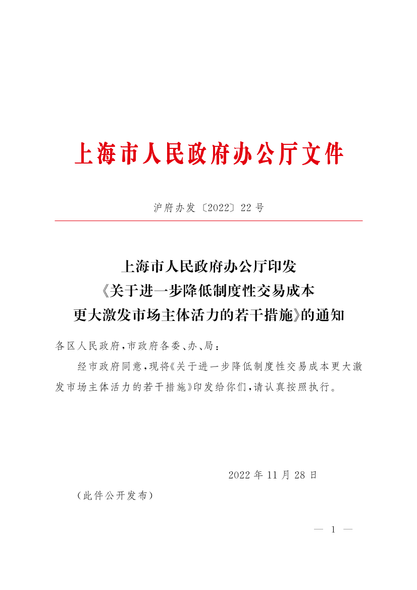 上海市人民政府办公厅印发《关于进一步降低制度性交易成本更大激发市场主体活力的若干措施》的通知