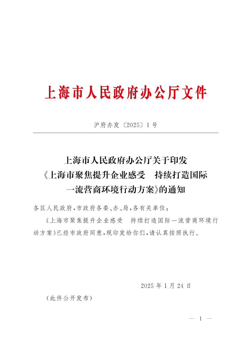 《上海市聚焦提升企业感受 持续打造国际一流营商环境行动方案》已经市政府同意,现印发给你们,请认真按照执行。