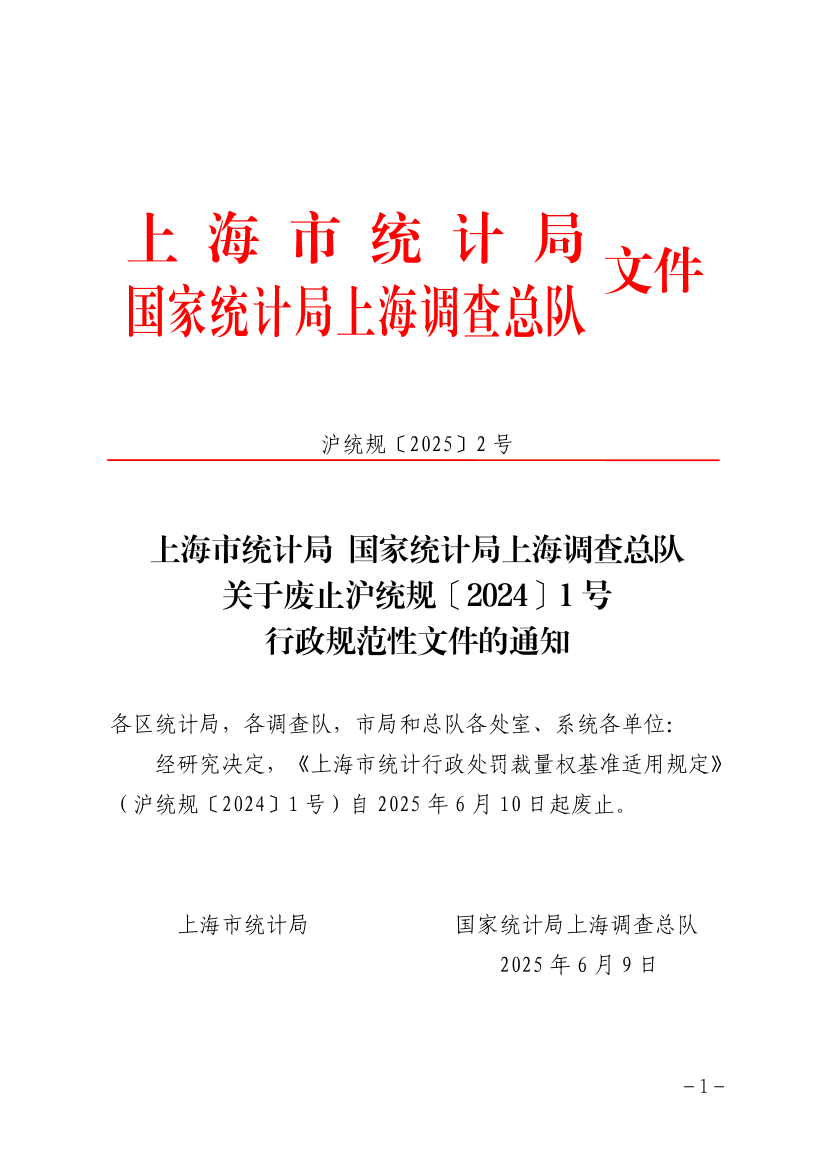 经研究决定,《上海市统计行政处罚裁量权基准适用规定》(沪统规〔2024〕1号)自2025年6月10日起废止。