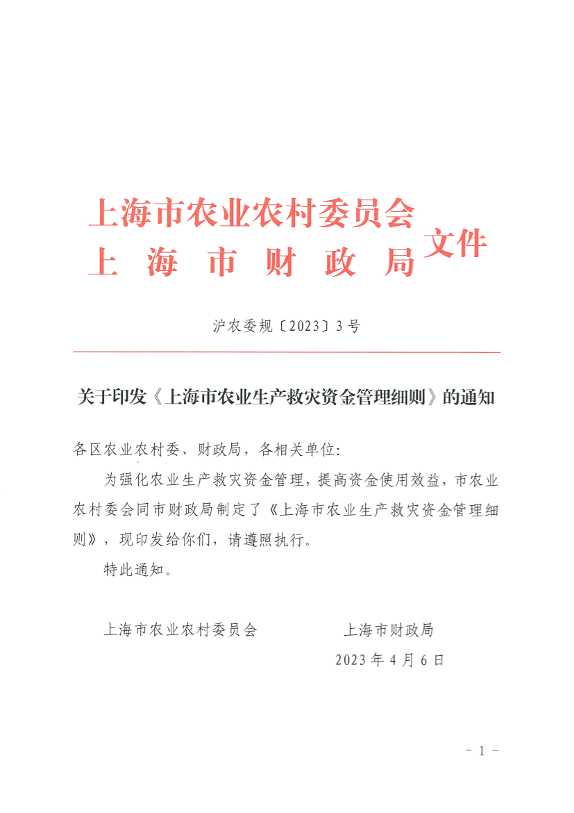 为强化农业生产救灾资金管理,提高资金使用效益,市农业农村委会同市财政局制定了《上海市农业生产救灾资金管理细则》,现印发给你们,请遵照执行。