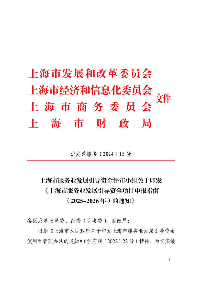 根据《上海市人民政府关于印发上海市服务业发展引导资金使用和管理办法的通知》(沪府规〔2022〕22号)精神,为切实做好我市服务业发展引导资金项目申报有关工作,市发展改革委、市经济信息化委、市商务委和市财政局组成的上海市服务业发展引导资金评审小组制定了《上海市服务业发展引导资金项目申报指南(2025-2026年)》。请按照要求,组织开展项目申报工作。