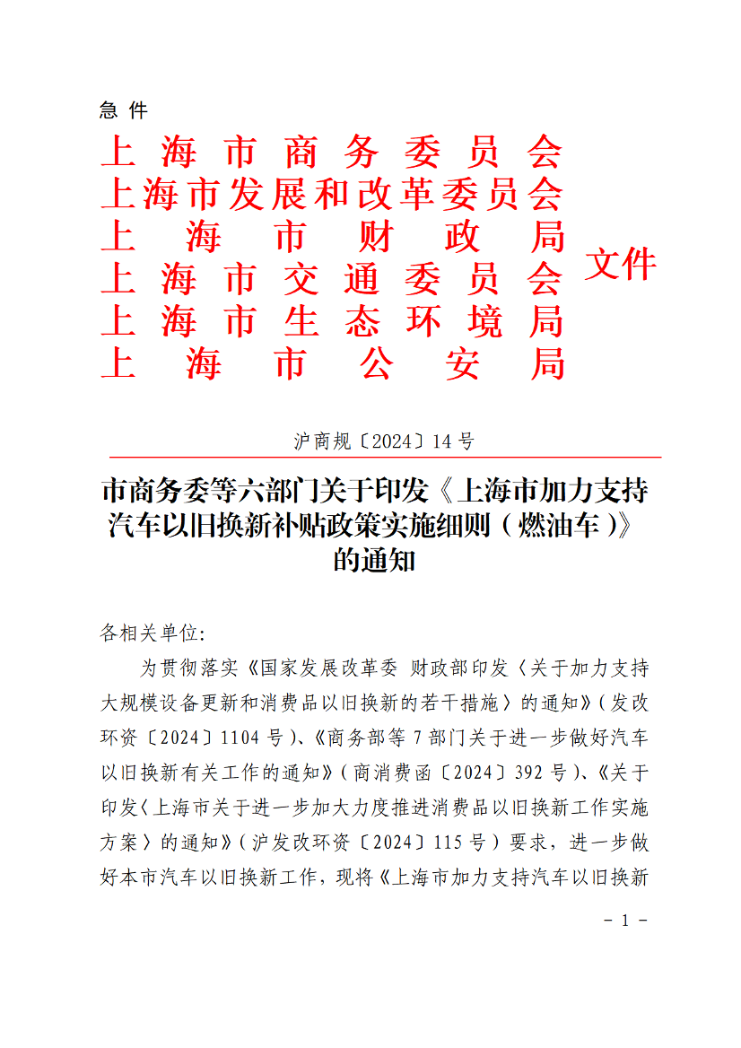 为贯彻落实《国家发展改革委 财政部印发〈关于加力支持大规模设备更新和消费品以旧换新的若干措施〉的通知》(发改环资〔2024〕1104号)、《商务部等7部门关于进一步做好汽车以旧换新有关工作的通知》(商消费函〔2024〕392号)、《关于印发〈上海市关于进一步加大力度推进消费品以旧换新工作实施方案〉的通知》(沪发改环资〔2024〕115号)要求,进一步做好本市汽车以旧换新工作,现将《上海市加力支持汽车以旧换新补贴政策实施细则(燃油车)》印发给你们,请遵照执行。