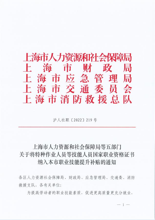 为提高劳动者的职业技能素质,促进更高质量更充分就业,根据《关于本市劳动者申领职业技能提升补贴有关事项的通知》(沪人社规〔2022〕17号),现就特种作业人员等技能人员国家职业资格证书纳入本市职业技能提升补贴的有关事项通知如下: