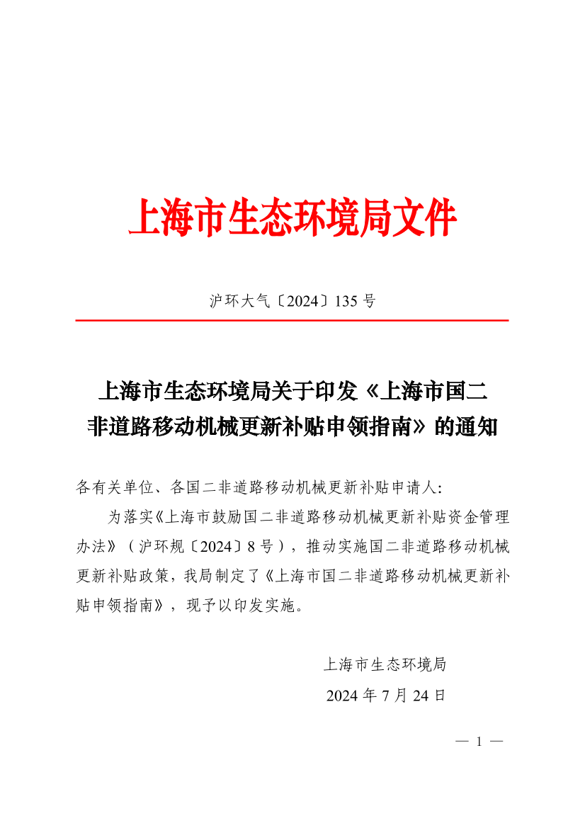 为落实《上海市鼓励国二非道路移动机械更新补贴资金管理办法》(沪环规〔2024〕8号),推动实施国二非道路移动机械更新补贴政策,我局制定了《上海市国二非道路移动机械更新补贴申领指南》,现予以印发实施。
