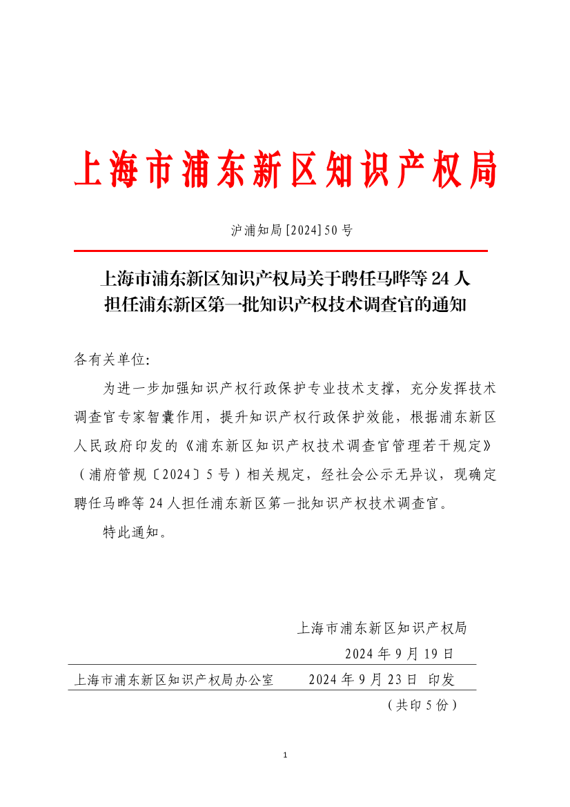 为进一步加强知识产权行政保护专业技术支撑,充分发挥技术调查官专家智囊作用,提升知识产权行政保护效能,根据浦东新区人民政府印发的《浦东新区知识产权技术调查官管理若干规定》(浦府管规〔2024〕5号)相关规定,经社会公示无异议,现确定聘任马晔等24人担任浦东新区第一批知识产权技术调查官。