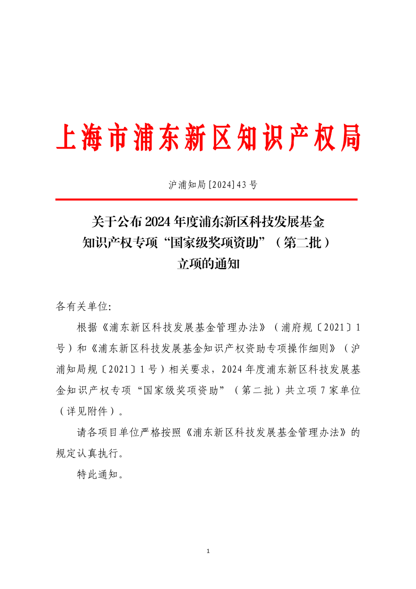 根据《浦东新区科技发展基金管理办法》(浦府规〔2021〕1号)和《浦东新区科技发展基金知识产权资助专项操作细则》(沪浦知局规〔2021〕1号)相关要求,2024年度浦东新区科技发展基金知识产权专项“国家级奖项资助”(第二批)共立项7家单位(详见附件)。