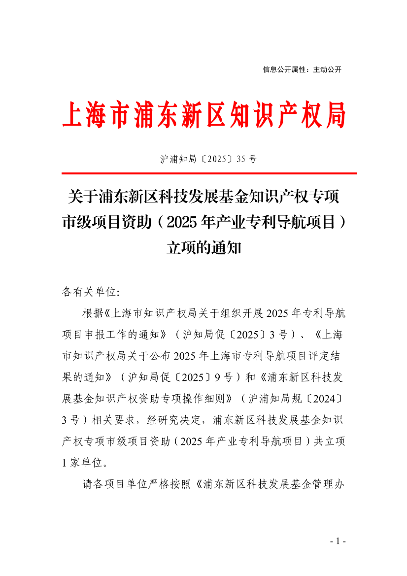 根据《上海市知识产权局关于组织开展2025年专利导航项目申报工作的通知》(沪知局促〔2025〕3号)、《上海市知识产权局关于公布2025年上海市专利导航项目评定结果的通知》(沪知局促〔2025〕9号)和《浦东新区科技发展基金知识产权资助专项操作细则》(沪浦知局规〔2024〕3号)相关要求,经研究决定,浦东新区科技发展基金知识产权专项市级项目资助(2025年产业专利导航项目)共立项1家单位。