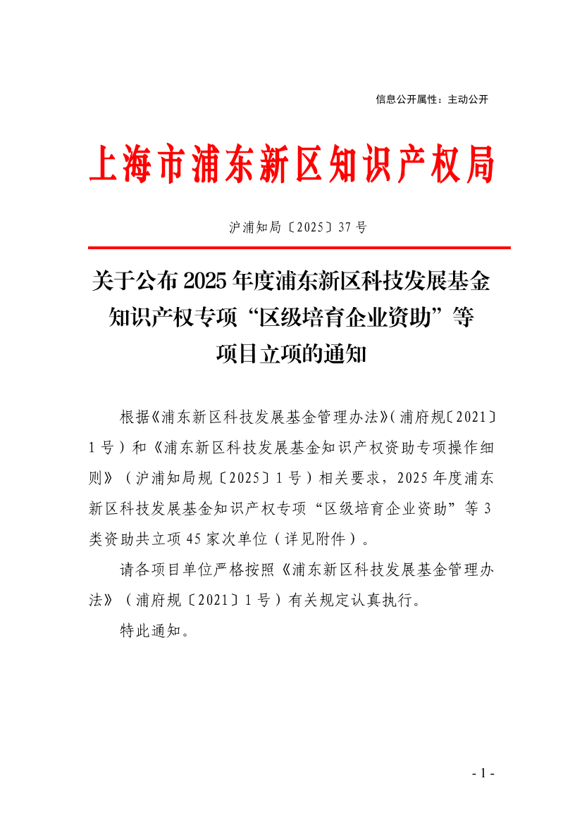 根据《浦东新区科技发展基金管理办法》(浦府规〔2021〕1号)和《浦东新区科技发展基金知识产权资助专项操作细则》(沪浦知局规〔2025〕1号)相关要求,2025年度浦东新区科技发展基金知识产权专项“区级培育企业资助”等3类资助共立项45家次单位(详见附件)。