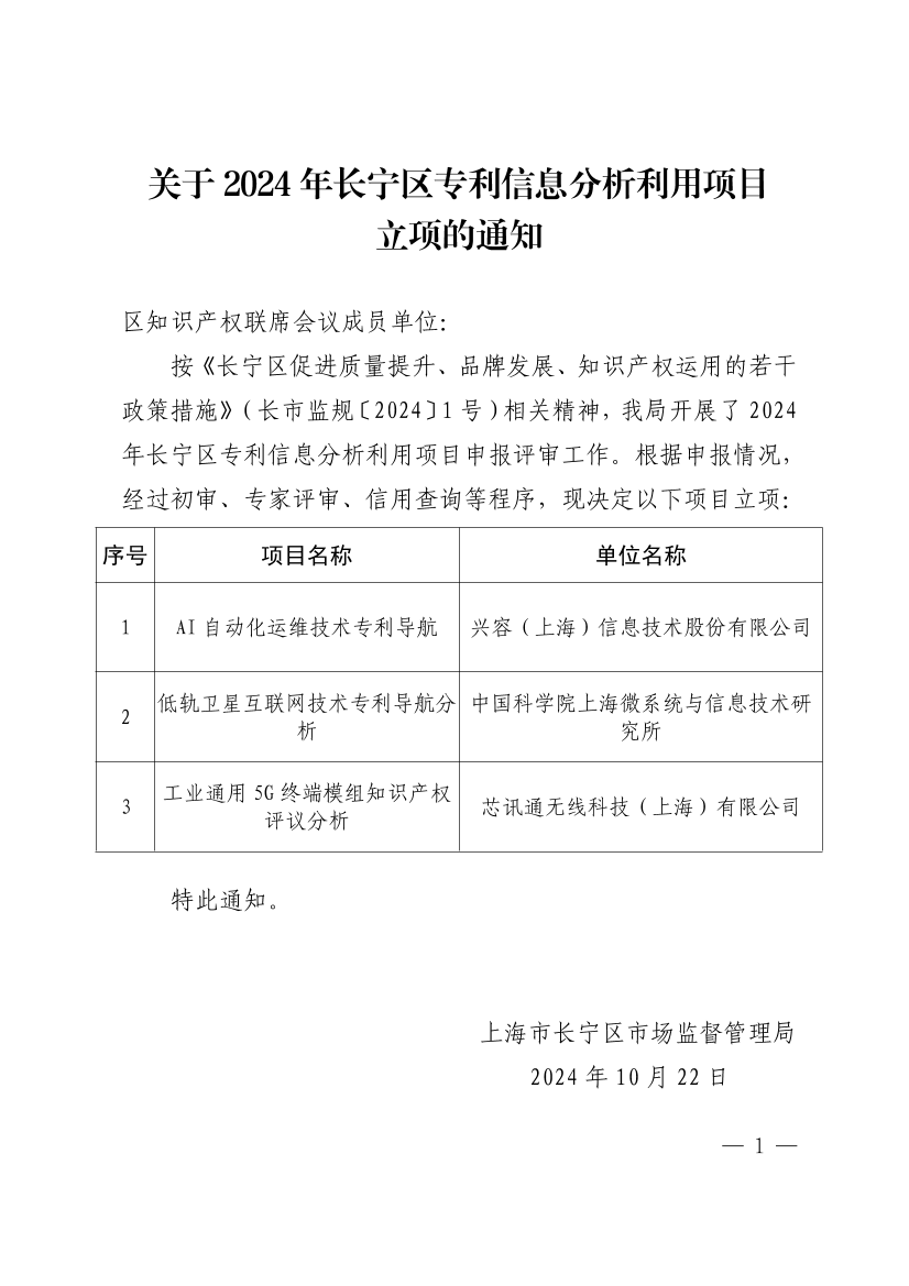 关于2024年长宁区专利信息分析利用项目立项的通知