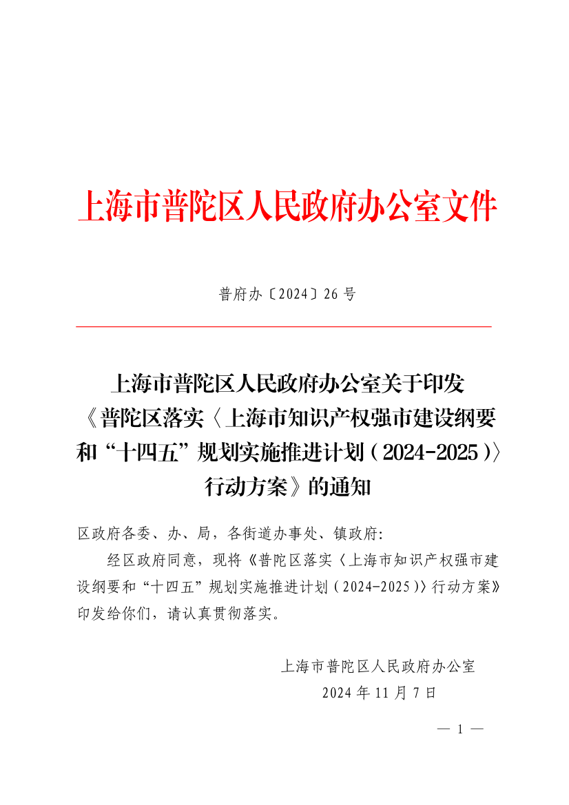 普陀区落实《上海市知识产权强市建设纲要和“十四五”规划实施推进计划(2024-2025)》行动方案