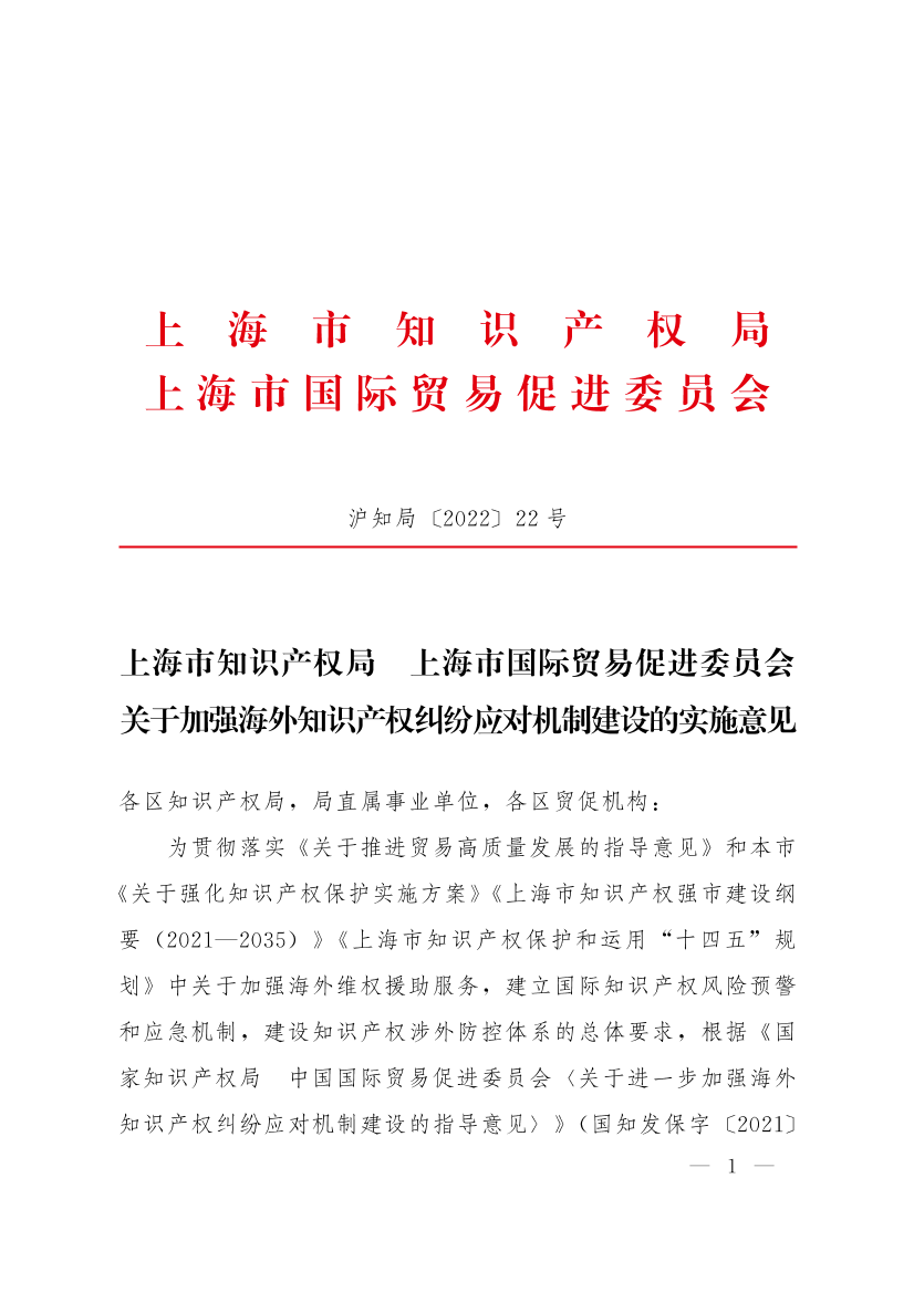 为贯彻落实《关于推进贸易高质量发展的指导意见》和本市《关于强化知识产权保护实施方案》《上海市知识产权强市建设纲要(2021--2035)》《上海市知识产权保护和运用“十四五”规划》中关于加强海外维权援助服务,建立国际知识产权风险预警和应急机制,建设知识产权涉外防控体系的总体要求,根据《国家知识产权局 中国国际贸易促进委员会<关于进一步加强海外知识产权纠纷应对机制建设的指导意见>》(国知发保字〔2021〕33号)的工作部署,上海市知识产权局会同上海市国际贸易促进委员会就加强我市海外知识产权纠纷应对机制建设研究制定如下实施意见。