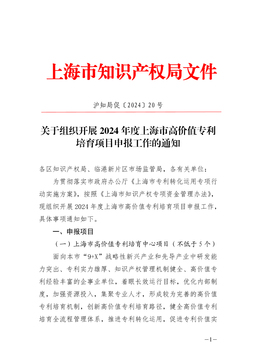 关于组织开展2024年度上海市高价值专利培育项目申报工作的通知