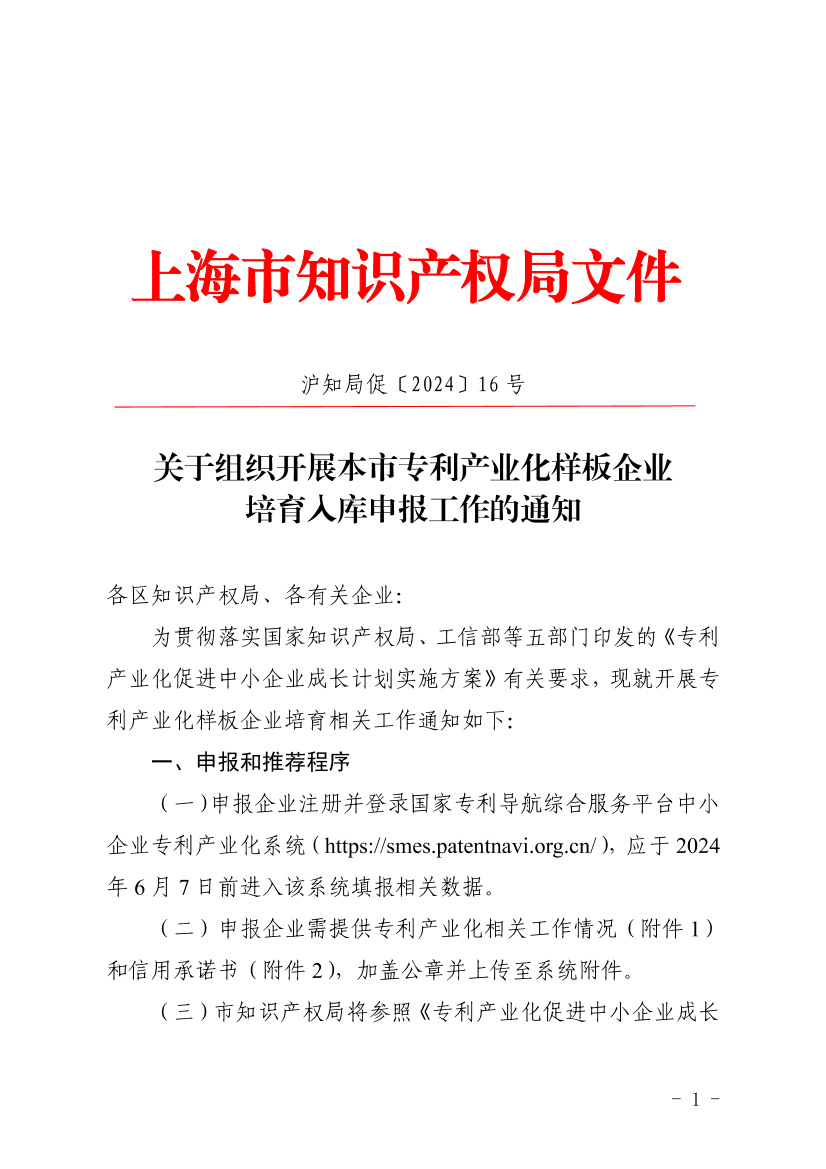 为贯彻落实国家知识产权局、工信部等五部门印发的《专利产业化促进中小企业成长计划实施方案》有关要求,现就开展专利产业化样板企业培育相关工作通知如下: