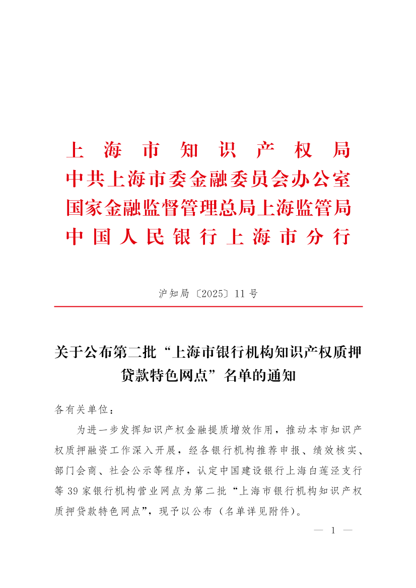 为进一步发挥知识产权金融提质增效作用,推动本市知识产权质押融资工作深入开展,经各银行机构推荐申报、绩效核实、部门会商、社会公示等程序,认定中国建设银行上海白莲泾支行等39家银行机构营业网点为第二批“上海市银行机构知识产权质押贷款特色网点”,现予以公布(名单详见附件)。