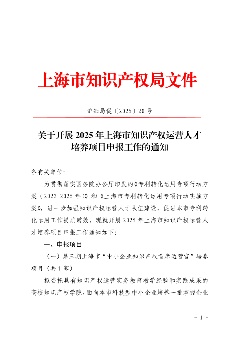 为贯彻落实国务院办公厅印发的《专利转化运用专项行动方案(2023-2025年)》和《上海市专利转化运用专项行动实施方案》,进一步加强知识产权运营人才队伍建设,促进本市专利转化运用工作提质增效,现就开展2025年上海市知识产权运营人才培养项目申报工作通知如下: