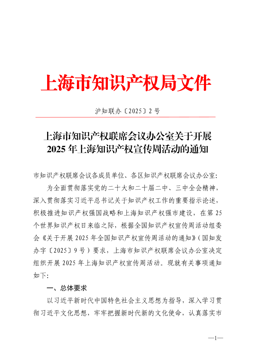 为全面贯彻落实党的二十大和二十届二中、三中全会精神,深入贯彻落实习近平总书记关于知识产权工作的重要指示论述,积极推进知识产权强国战略和上海知识产权强市建设,在第25个世界知识产权日来临之际,根据全国知识产权宣传周活动组委会《关于开展2025年全国知识产权宣传周活动的通知》(国知发办字〔2025〕9号)要求,上海市知识产权联席会议办公室决定组织开展2025年上海知识产权宣传周活动。现就有关事项通知如下:
