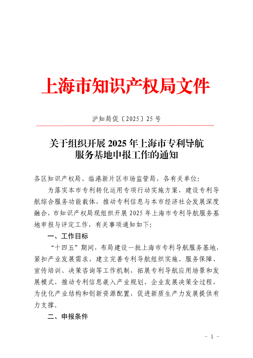 为落实本市专利转化运用专项行动实施方案,建设专利导航综合服务功能载体,推动专利信息与本市经济社会发展深度融合,市知识产权局现组织开展2025年上海市专利导航服务基地申报与评定工作,有关事项通知如下: