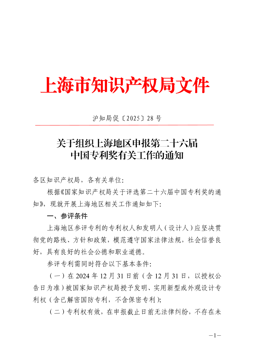 根据《国家知识产权局关于评选第二十六届中国专利奖的通知》,现就开展上海地区相关工作通知如下: