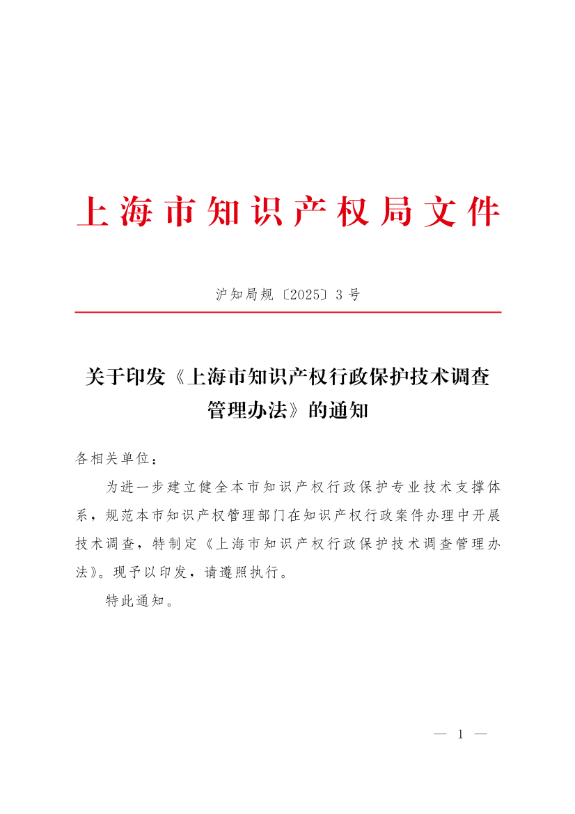 为进一步建立健全本市知识产权行政保护专业技术支撑体系,规范本市知识产权管理部门在知识产权行政案件办理中开展技术调查,特制定《上海市知识产权行政保护技术调查管理办法》。现予以印发,请遵照执行。
