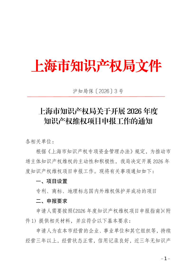 上海市知识产权局关于开展2026年度知识产权维权项目申报工作的通知