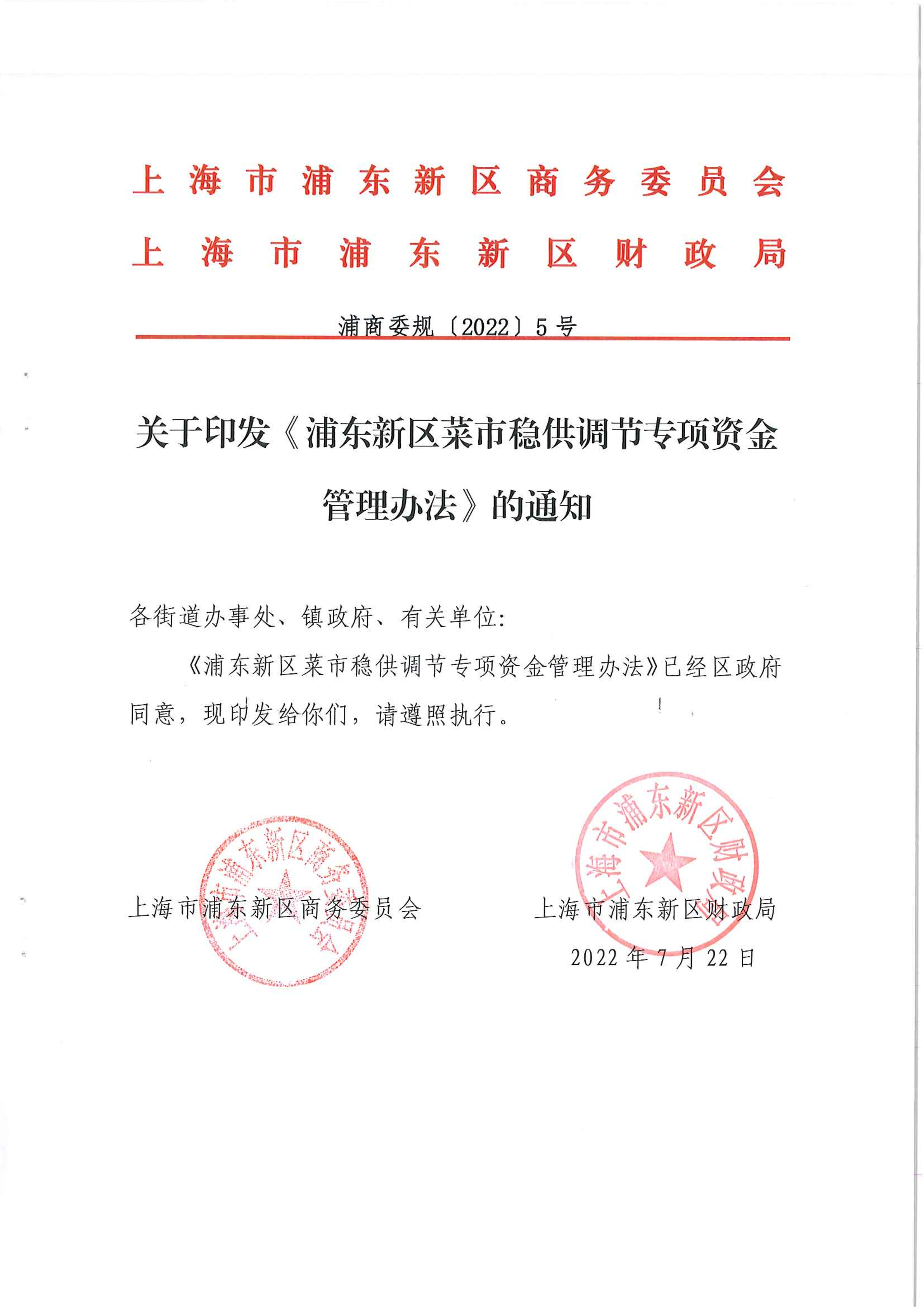 《浦东新区菜市稳供调节专项资金管理办法》已经区政府同意,现印发给你们,请遵照执行。