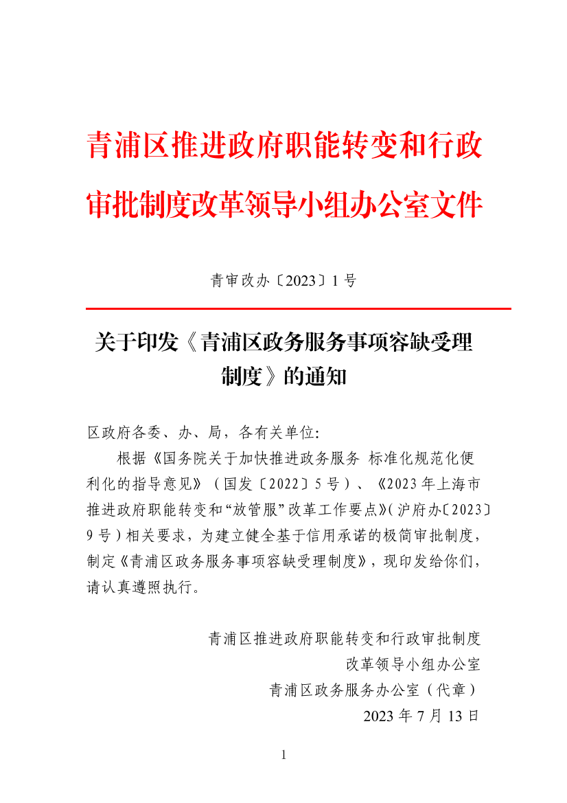 根据《国务院关于加快推进政务服务 标准化规范化便利化的指导意见》(国发〔2022〕5号)、《2023年上海市推进政府职能转变和“放管服”改革工作要点》(沪府办〔2023〕9号)相关要求,为建立健全基于信用承诺的极简审批制度,制定《青浦区政务服务事项容缺受理制度》,现印发给你们,请认真遵照执行。