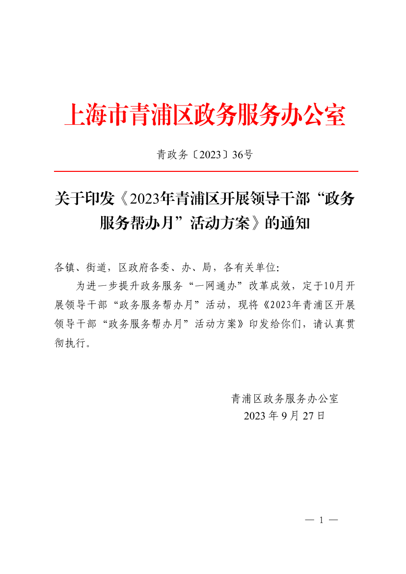为进一步提升政务服务“一网通办”改革成效,定于10月开展领导干部“政务服务帮办月”活动,现将《2023年青浦区开展领导干部“政务服务帮办月”活动方案》印发给你们,请认真贯彻执行。
