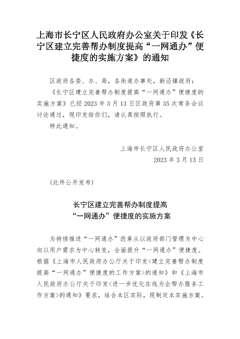 《长宁区建立完善帮办制度提高“一网通办”便捷度的实施方案》已经2023年3月13日区政府第35次常务会议讨论通过,现印发给你们,请认真按照执行。