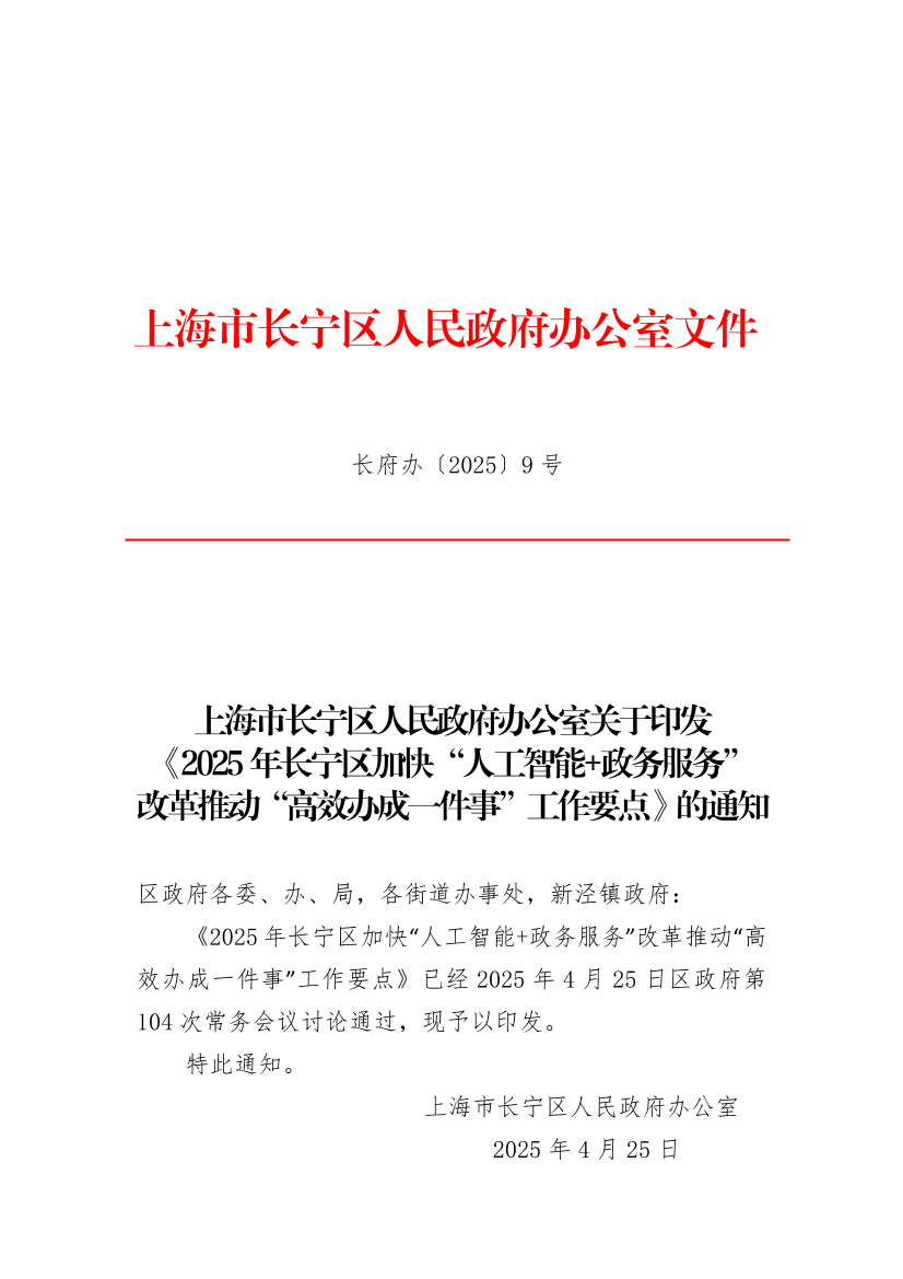 《2025年长宁区加快“人工智能+政务服务”改革推动“高效办成一件事”工作要点》已经2025年4月25日区政府第104次常务会议讨论通过,现予以印发。