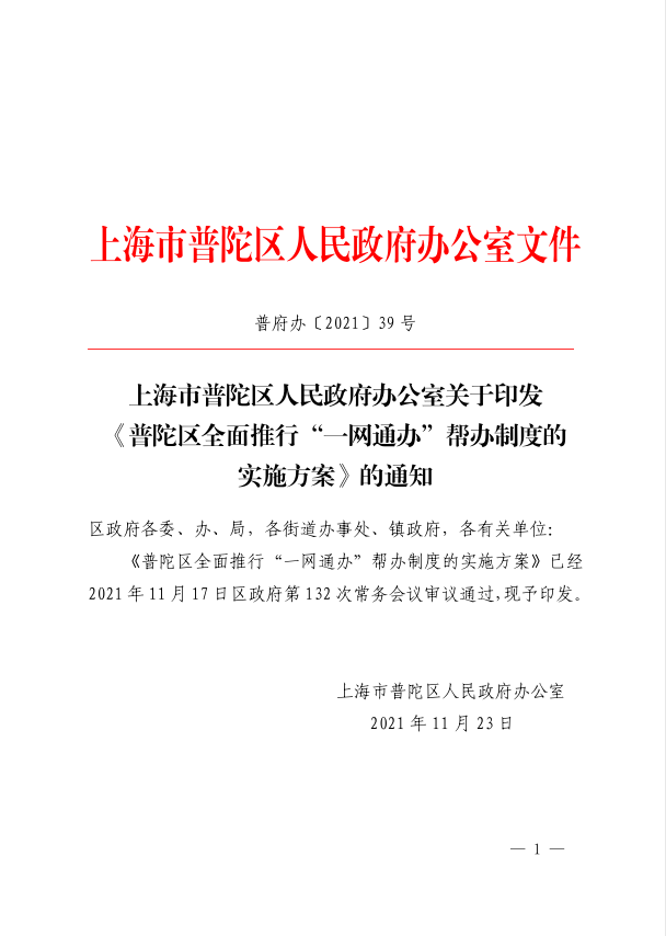 《普陀区全面推行“一网通办”帮办制度的实施方案》已经2021年11月17日区政府第132次常务会议审议通过,现予印发。