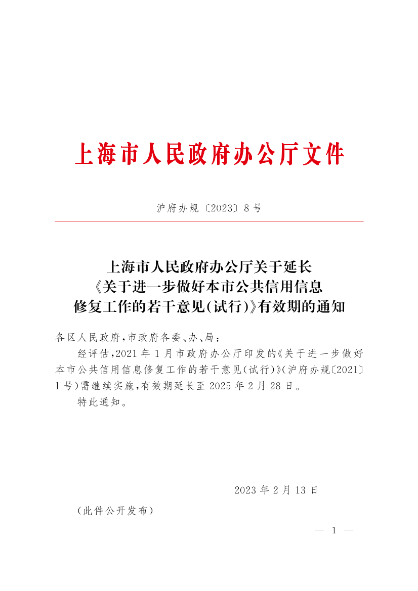 经评估,2021年1月市政府办公厅印发的《关于进一步做好本市公共信用信息修复工作的若干意见(试行)》(沪府办规〔2021〕1号)需继续实施,有效期延长至2025年2月28日。