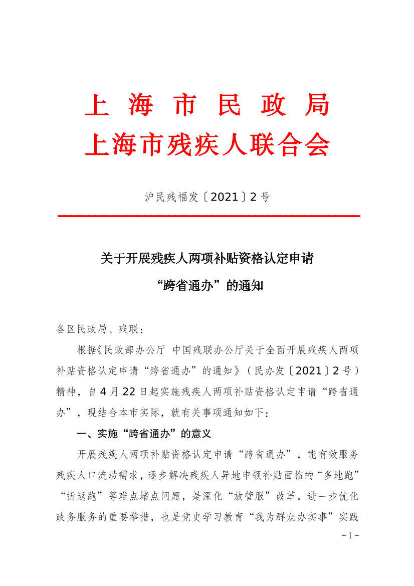 根据《民政部办公厅 中国残联办公厅关于全面开展残疾人两项补贴资格认定申请“跨省通办”的通知》(民办发〔2021〕2号)精神,自4月22日起实施残疾人两项补贴资格认定申请“跨省通办”,现结合本市实际,就有关事项通知如下: