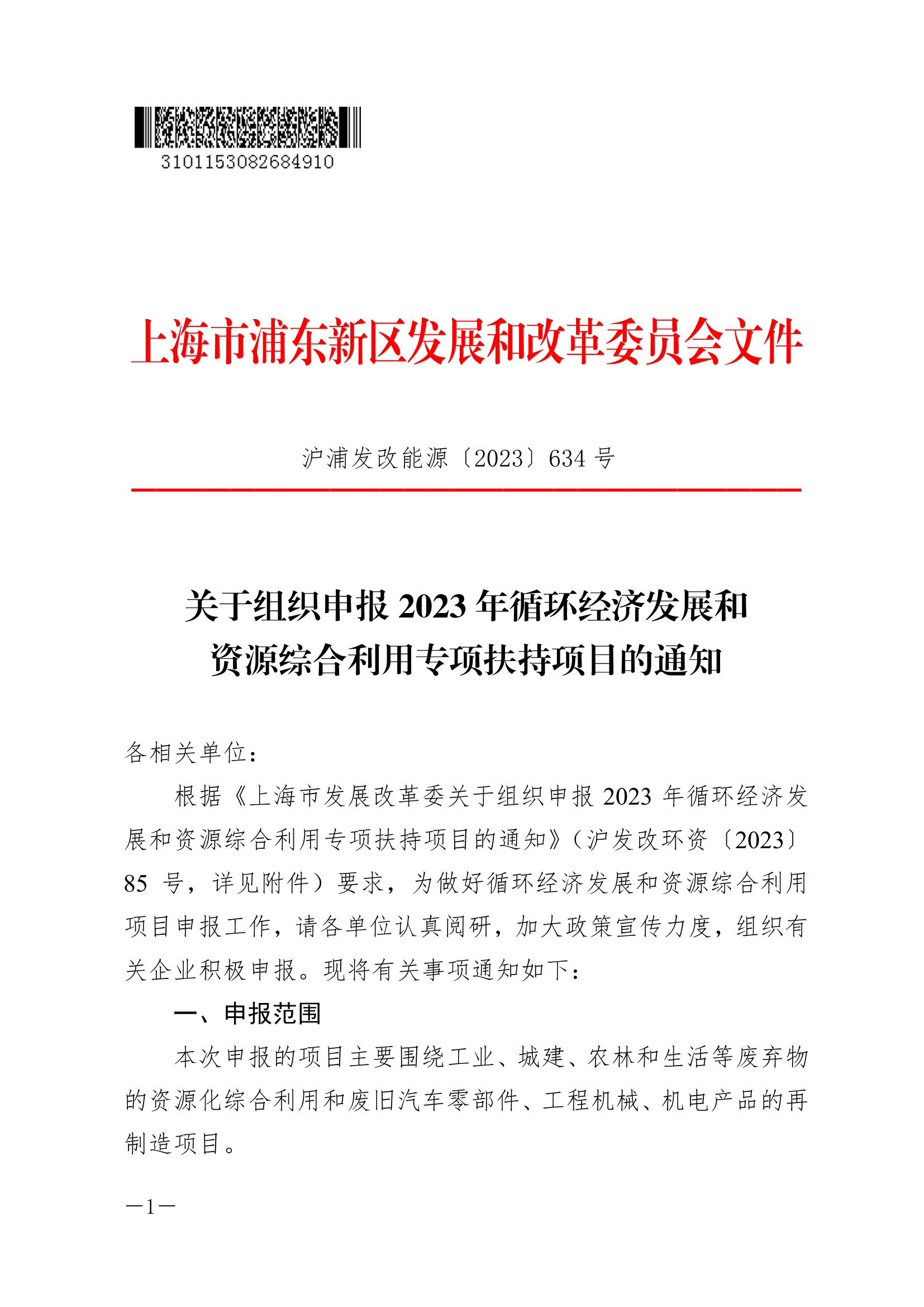 根据《上海市发展改革委关于组织申报2023年循环经济发展和资源综合利用专项扶持项目的通知》(沪发改环资〔2023〕85号,详见附件)要求,为做好循环经济发展和资源综合利用项目申报工作,请各单位认真阅研,加大政策宣传力度,组织有关企业积极申报。现将有关事项通知如下: