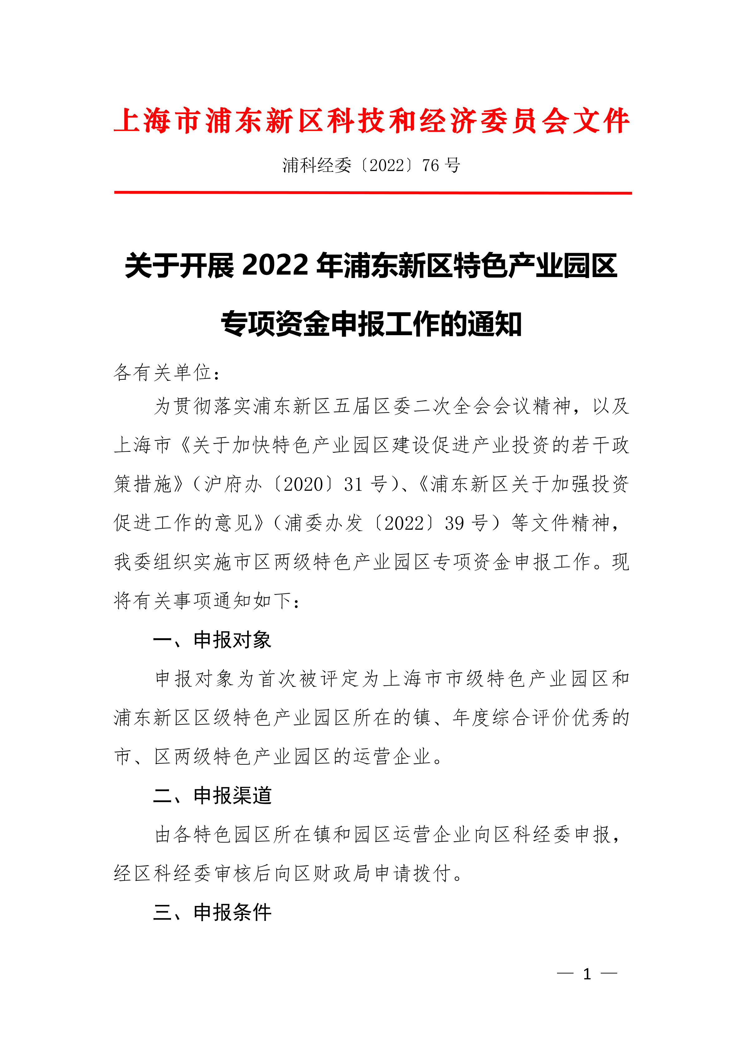 为贯彻落实浦东新区五届区委二次全会会议精神,以及上海市《关于加快特色产业园区建设促进产业投资的若干政策措施》(沪府办〔2020〕31号)、《浦东新区关于加强投资促进工作的意见》(浦委办发〔2022〕39号)等文件精神,我委组织实施市区两级特色产业园区专项资金申报工作。现将有关事项通知如下: