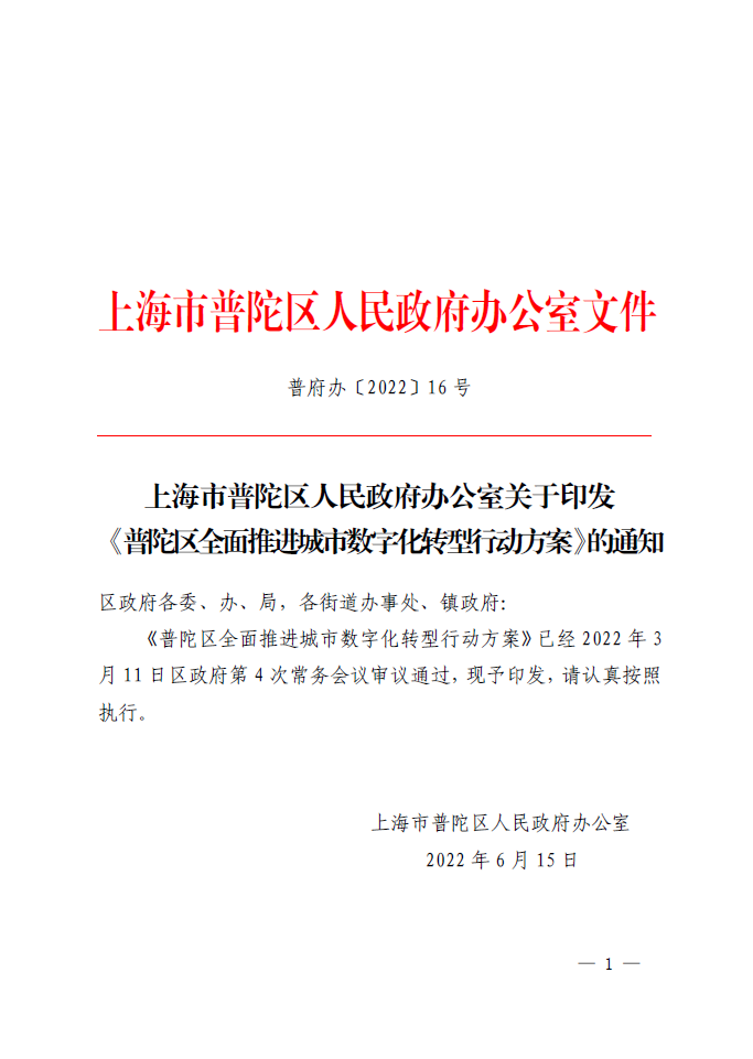《普陀区全面推进城市数字化转型行动方案》已经2022年3月11日区政府第4次常务会议审议通过,现予印发,请认真按照执行。