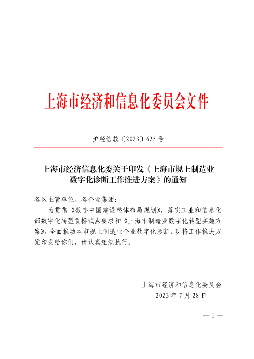 为贯彻《数字中国建设整体布局规划》,落实工业和信息化部数字化转型贯标试点要求和《上海市制造业数字化转型实施方案》,全面推动本市规上制造业企业数字化诊断,现将工作推进方案印发给你们,请认真组织执行。