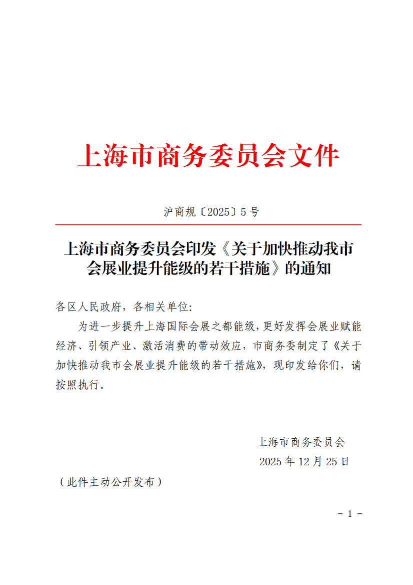 为进一步提升上海国际会展之都能级,更好发挥会展业赋能经济、引领产业、激活消费的带动效应,市商务委制定了《关于加快推动我市会展业提升能级的若干措施》,现印发给你们,请按照执行。
