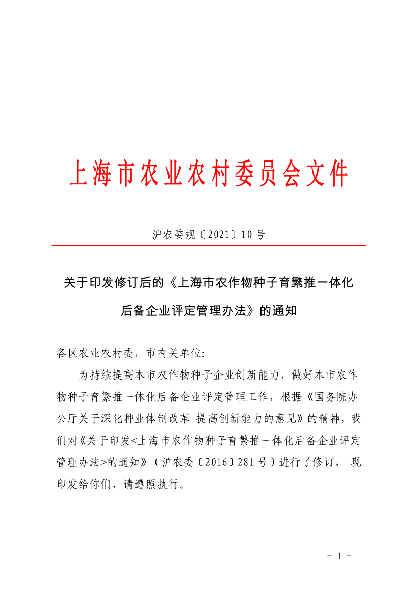 1.上海市农作物种子育繁推一体化后备企业评定管理办法