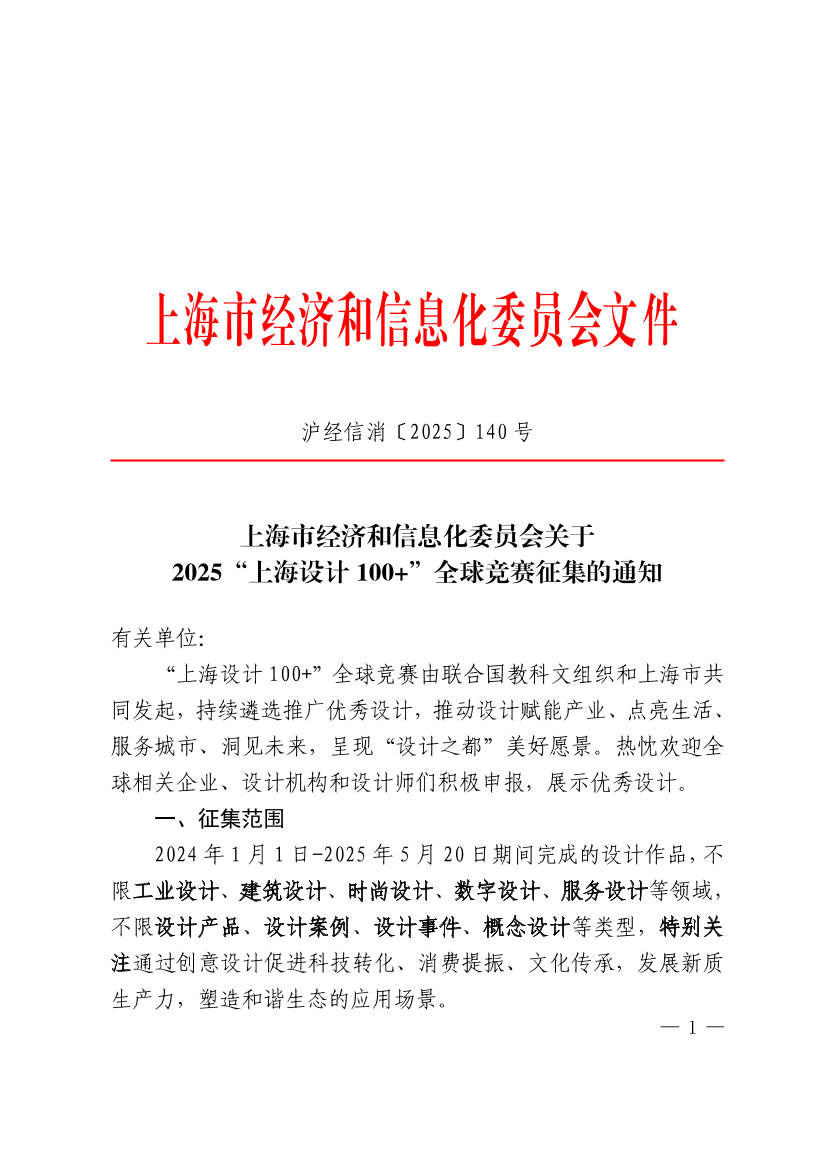 2024年1月1日-2025年5月20日期间完成的设计作品,不限工业设计、建筑设计、时尚设计、数字设计、服务设计等领域,不限设计产品、设计案例、设计事件、概念设计等类型,特别关注通过创意设计促进科技转化、消费提振、文化传承,发展新质生产力,塑造和谐生态的应用场景。