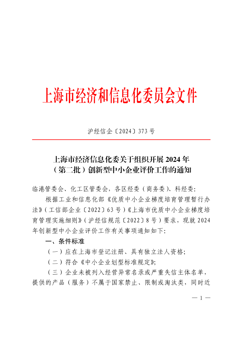 根据工业和信息化部《优质中小企业梯度培育管理暂行办法》(工信部企业〔2022〕63号)《上海市优质中小企业梯度培育管理实施细则》(沪经信规范〔2022〕8号)要求,现就2024年创新型中小企业评价工作有关事项通知如下:
