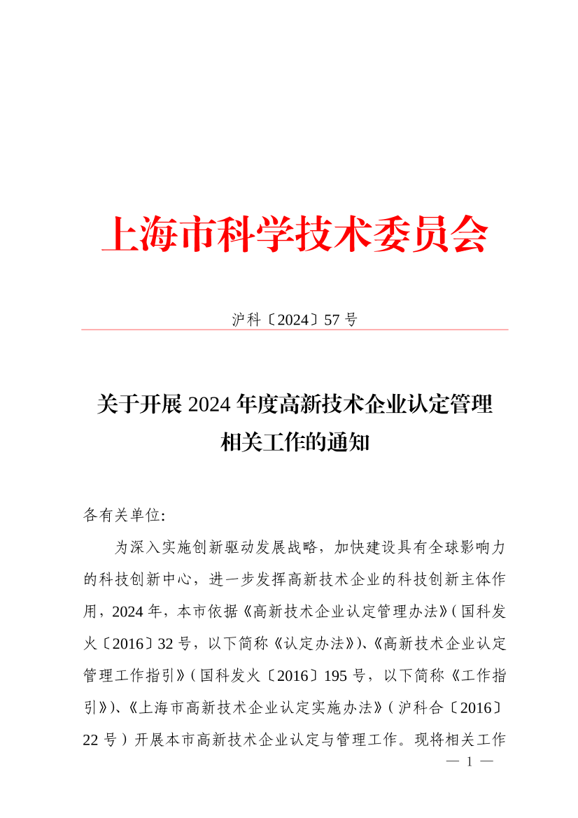 为深入实施创新驱动发展战略,加快建设具有全球影响力的科技创新中心,进一步发挥高新技术企业的科技创新主体作用,2024年,本市依据《高新技术企业认定管理办法》(国科发火〔2016〕32号,以下简称《认定办法》)、《高新技术企业认定管理工作指引》(国科发火〔2016〕195号,以下简称《工作指引》)、《上海市高新技术企业认定实施办法》(沪科合〔2016〕22号)开展本市高新技术企业认定与管理工作。现将相关工作安排如下:
