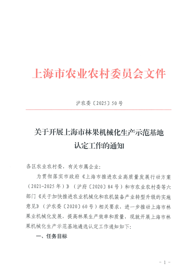 为贯彻落实市政府《上海市推进农业高质量发展行动方案(2021-2025年)》(沪府〔2020〕84号)和市农业农村委等六部门《关于加快推进农业机械化和农机装备产业转型升级的实施意见》(沪农委〔2020〕60号)相关要求,进一步推动上海市林果业机械化发展,提高林果生产效率和质量,现就开展上海市林果机械化生产示范基地遴选认定工作通知如下: