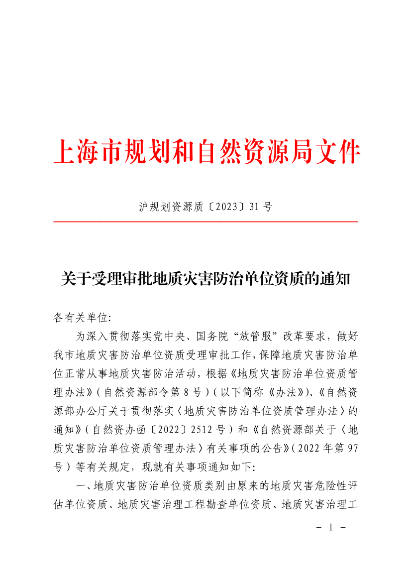 二、地质灾害防治单位资质等级由原来的甲乙丙三级压减为甲乙两级,上海市规划和自然资源局负责注册地在上海市行政区域内的地质灾害防治单位甲级、乙级资质的受理审批。