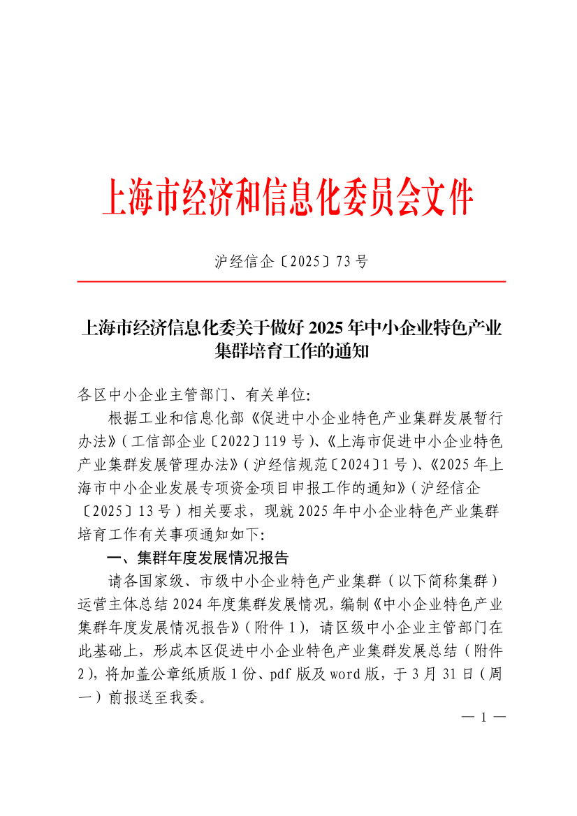 根据工业和信息化部《促进中小企业特色产业集群发展暂行办法》(工信部企业〔2022〕119号)、《上海市促进中小企业特色产业集群发展管理办法》(沪经信规范〔2024〕1号)、《2025年上海市中小企业发展专项资金项目申报工作的通知》(沪经信企〔2025〕13号)相关要求,现就2025年中小企业特色产业集群培育工作有关事项通知如下: